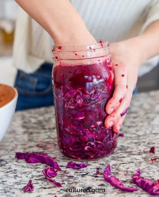 After a few more minutes, stuff the cabbage into the jar, pushing it down as hard as you can using your fist. Once all the sauerkraut is in, make sure you have enough brine to cover to sauerkraut. You can do this with your hand in a fist or you can buy a tamper tool. If you find that you do not have enough liquid to cover the brine you can add some more clean filtered water.