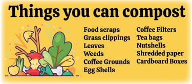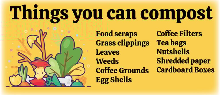 In order to compost, you need carbon, nitrogen, heat, and water. Carbon items could be leaves, shredded cardboard, twigs, woodchips, paper, and even all cotton fabrics. Nitrogen items could be grass clipping, fruit and vegetable scraps, animal manure (not from your pets -- chicken, horse, goat, rabbit and other herbivores), eggshells, coffee grounds and plant trimmings.