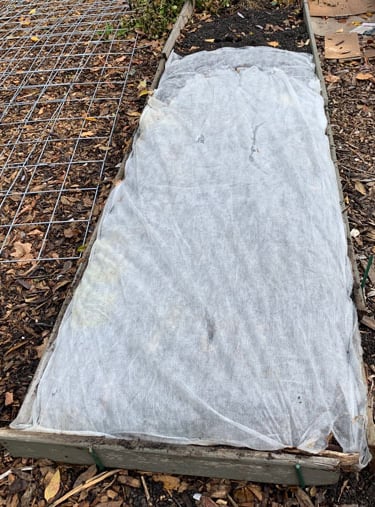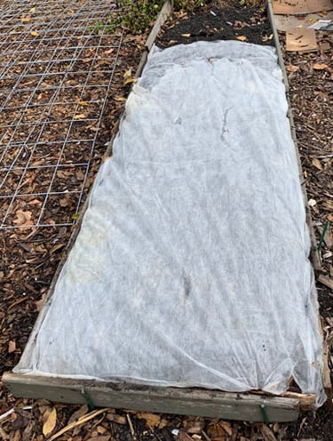 Floating Row Cover - this puts a barrier between any predators and your plants. One example is in the fall when you plant your garlic, put the row cover over the garlic plot so the squirrels don't dig up the cloves you have just planted. In the spring when they start to sprout you can remove the row cover and let the plants grow. You can also use the row covers to drape over your plants that might be infected with cabbage worms.